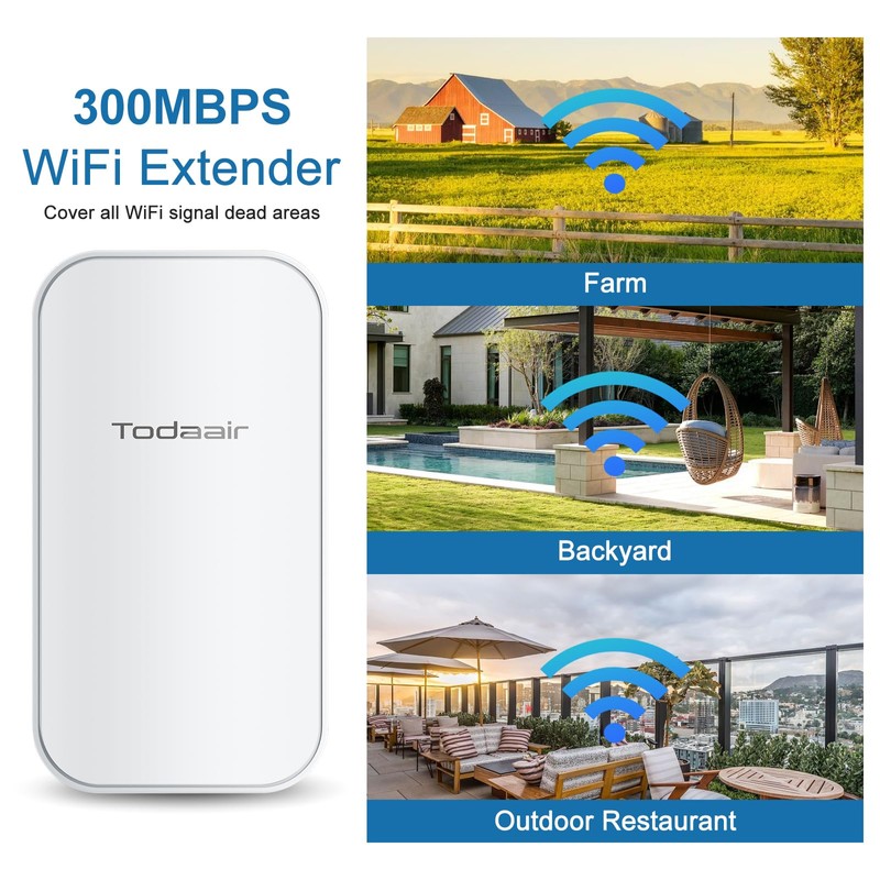 【Strong signal expansion, covering no blind spots】:Specially designed to enhance wireless network signals, it can easily penetrate walls and obstacles, extending Wi Fi signals to areas that are difficult to cover outdoors or at home. With a transmission speed of up to 300mbps, you can enjoy a smooth and unobstructed network experience when making video calls, playing online games, or streaming media. 【 Supports 2 Working Modes 】:TODAAIR wifi extender supports relay mode and access point mode. It has an Ethernet port with repeater/AP, which can easily turn your wired Internet connection into a wireless access point, providing a flexible operation mode to meet your diverse network needs. 【Wide Compatibility】:Compatible with various mainstream wifi devices and routers, no matter which brand of device you are using, you can easily connect and expand network coverage. 【Security】:TODAAIR outdoor wifi extender supports WPA-PSK/WPA2-PSK and WPA/WPA2 wireless security protocols. This Outdoor WiFi Extender maximizes network security, keeping your network secure and protecting your important personal data from unauthorized access. 【Outdoor Waterproof】:TODAAIR wifi extender adopts Ip65 waterproof shell, lightning proof, waterproof, dust proof, anti-freezing, high temperature resistance, corrosion resistance, can resist bad weather and environmental erosion, to ensure that it can operate normally under various weather conditions. 【Easy to Set up & Supported by Professional Technical Teams】: If you have any questions during the installation process, you can open the installation video below the window picture to watch. Pls contact us when you meet problems when using WiFi Extender, our Technical Team will help you fix it asap.