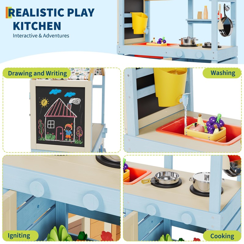 - 【Interactive Sensory Play】This mud kitchen for kids outdoor features a removable sink, rotatable faucet, and playful switches that let children mix mud pies and store soil, turning outdoor play into an imaginative experience. The stove knobs produce realistic clicking sounds, while dual-sided chalkboards invite kids to draw recipes and menus, boosting creativity and communication in this sensory-rich mud table and outdoor play kitchen.