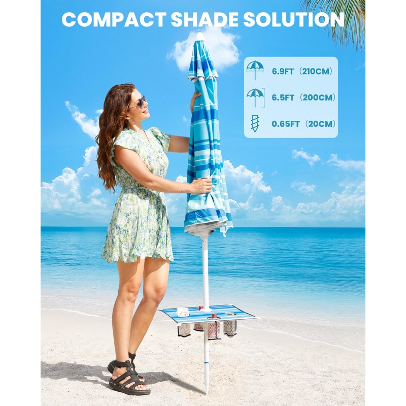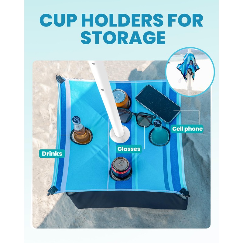 - WHAT MAKES THIS BEACH UMBRELLA SPECIAL? - The FREE SAND BAG, together with the CUP HOLDER, is the answer! The sand bag can be filled with 44lb sands to resist the beach umbrella from coming loose in gusty winds. HANDY PATENTED POP-OPEN TABLE WITH CUP HOLDER keep your drinks, phone, and sunglasses out of the sand. No more worries and mess! Cup holders are only available in certain colors. (US Patent number 9706834B1)