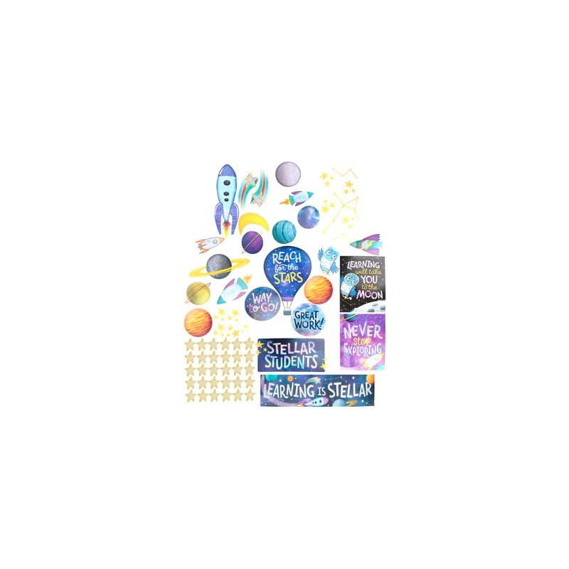 - Complete 65-Piece Set: Includes 2 headers, 2 posters, 5 rockets, 7 planets, and 49 accent pieces for a full, eye-catching space-themed display.