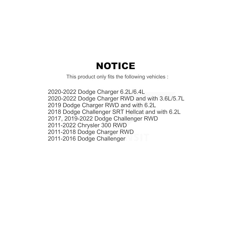 - Replacement for: [Front Outer] 2017-2023 Dodge Challenger (RWD), 2011-2023 Chrysler 300 (RWD), 2011-2023 Dodge Charger (RWD), 2011-2016 Dodge Challenger