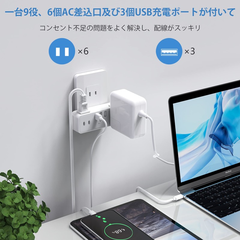 - 9-in-1 Outlet Tap: USB tap with 6 AC outlets and 3 USB ports. One power tap allows you to charge your smartphone or tablet without the need for an AC adapter