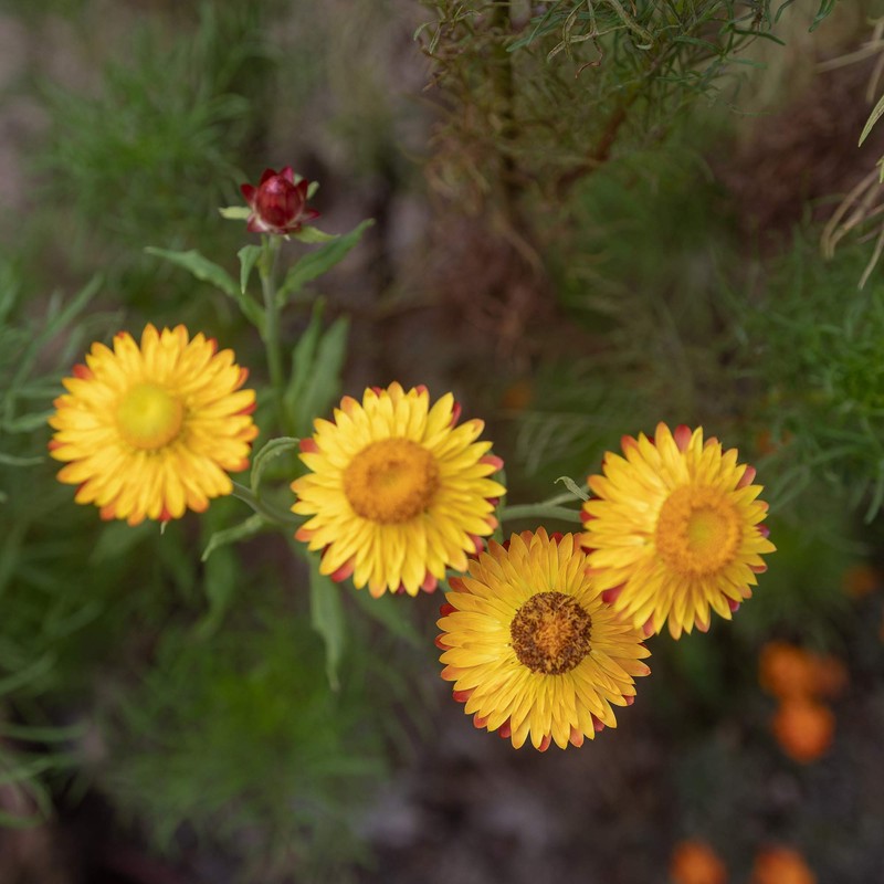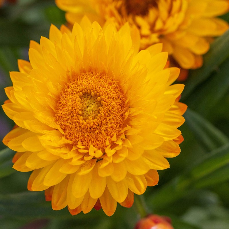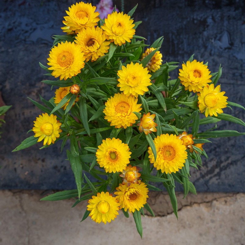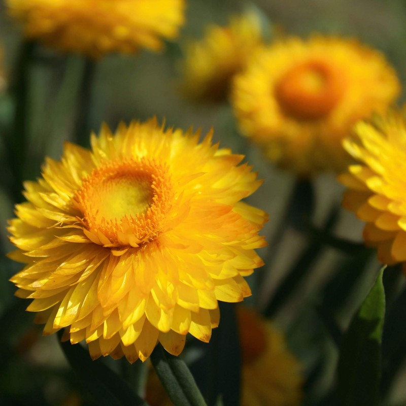 Helichrysum bracteatum is commonly referred to as Strawflower, and it is perfect for areas with long, hot summers. These annuals are easy to establish from seed and fast to grow and bloom. They provide a wonderful color display in the garden with 2 inch daisy-like blooms. This Yellow Strawflower will perform from spring through fall. They are prized as a cut flower and dry well keeping their color and being considered an everlasting. To dry, cut the flowers when the lower petals are just starting to open. Remove the leaves and hang them in loose bunches in a well-ventilated, warm area. Start the seed indoors 6 – 8 weeks before the last expected frost. Press the seeds into the soil but do not cover. Keep the seed moist until germination. With temperatures of 72 - 76F, germination is normally within 10 days. Transplant outdoors after frost danger has passed. Space the plants 18 - 24 inches apart. For areas with a long growing season, the seed can be planted directly outdoors once temperatures are consistently warm. Grow in full sun to partial shade and in moist, well-drained soil. Helichrysum is usually resistant to deer. Deadhead the spent blooms to keep them performing their best.