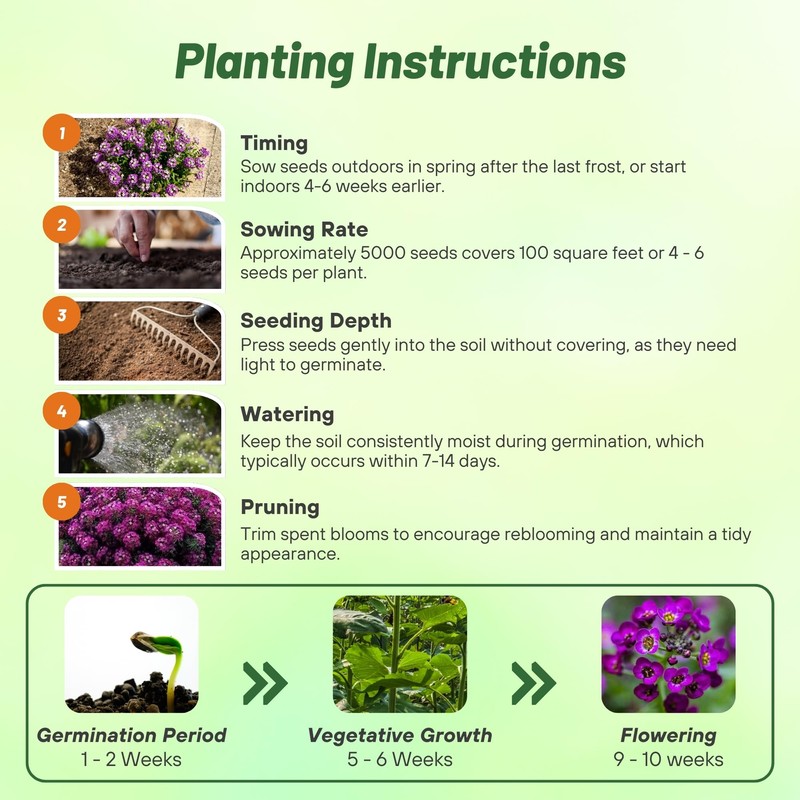 - EASY PLANTING & DEER PROOF: Our alyssum flower seed packets are beginner-friendly as they only require a sow rate of approximately 5000 seeds per 100 square feet or 4-6 seeds per plant and a germination time of 7-21 days without the need for covering. Naturally deer deterrent, they ensure your garden remains vibrant and untouched even in wildlife prone areas.