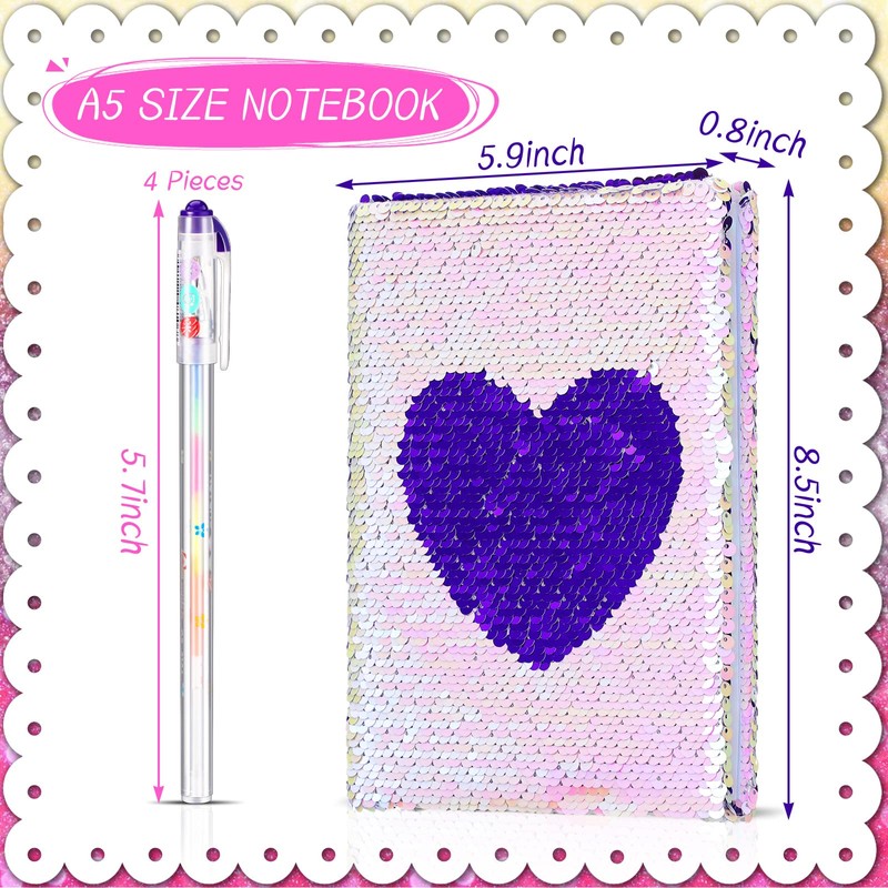 Outus Sequin Notebook Set with 4 Pieces Color Gel Ink Pens Reversible Diary Flip Sequin Journal Writing Journal Set for Valentine's Day Teens Young Girls (Purple Pink)