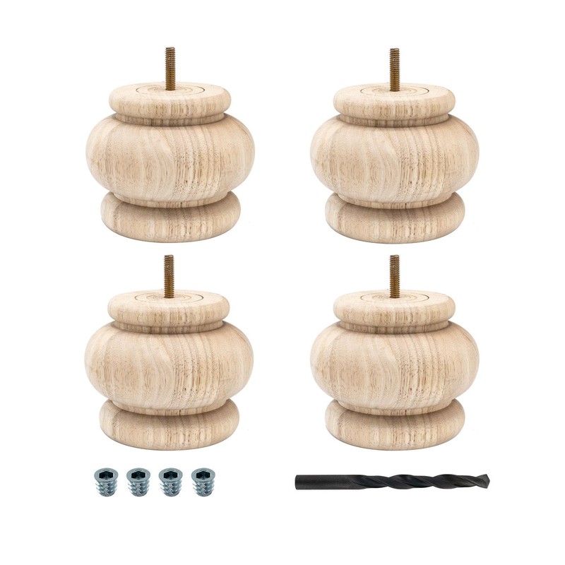 OUTWATER 4 in. H x 4-7/8 in. Dia Unfinished Solid Hardwood Round Bun Foot | 4 Pack with 4 Free Insert Nuts and Drill Bit