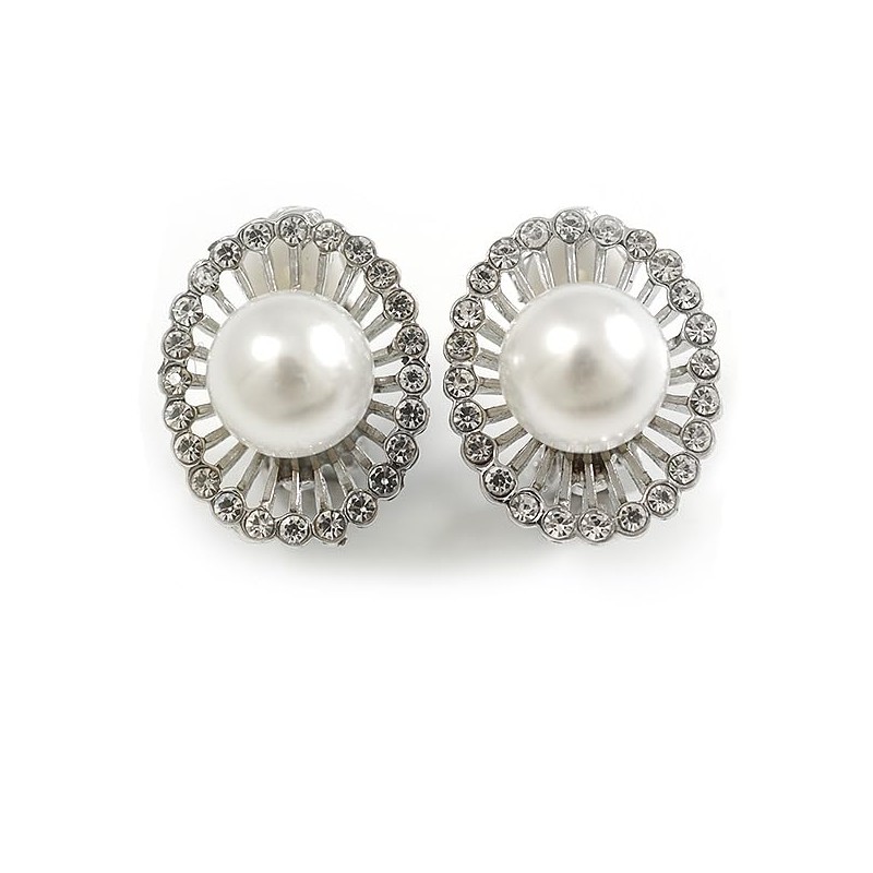 Oval Crystal Faux Pearl Bead Clip On Earrings in Silver Tone - 20mm Tall