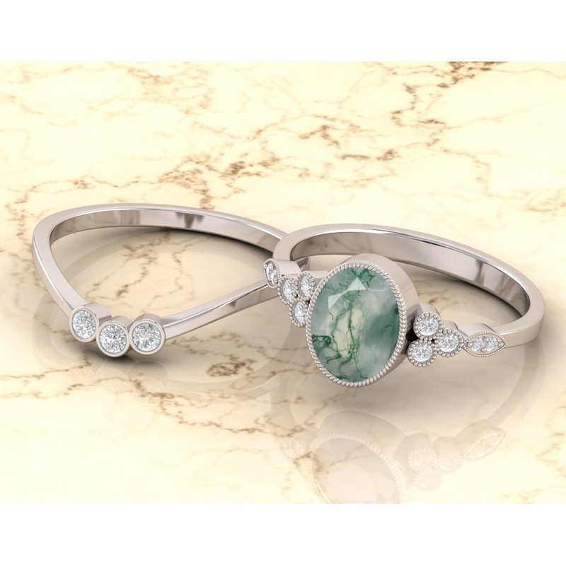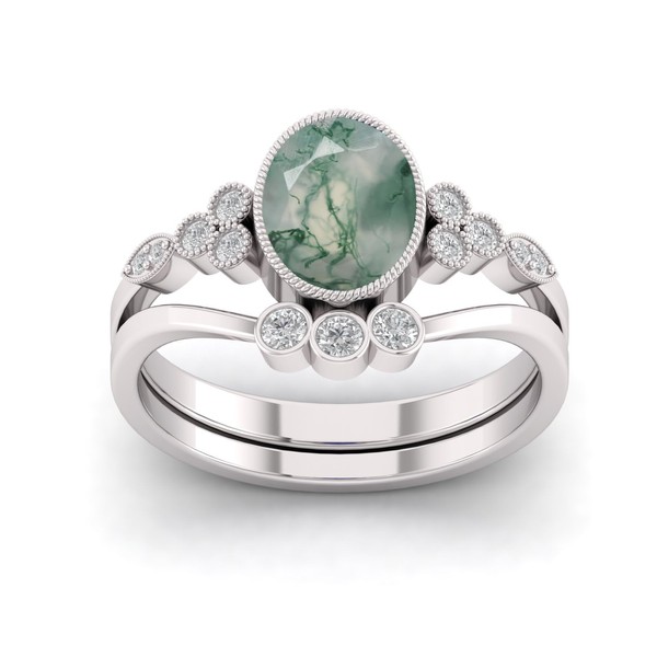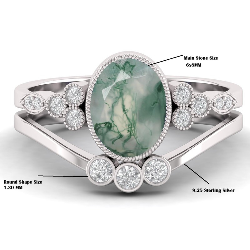Oval Shape Natural Moss Agate Gemstone Wedding Ring Set, 925 Sterling Silver Nature Inspired Moss Agate Unique Dainty Branch Statement Ring, Gift for Her (UN-OVAL-A, 7)