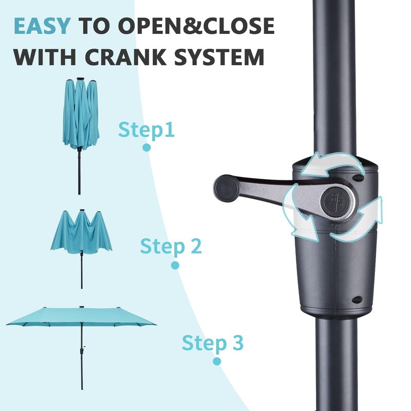 - Easy to set up: When the center pole is placed in the upright position, the canopy can be raised and fully opened by rotating the hand crank of the umbrella. Turn the hand crank in the opposite direction to close the top