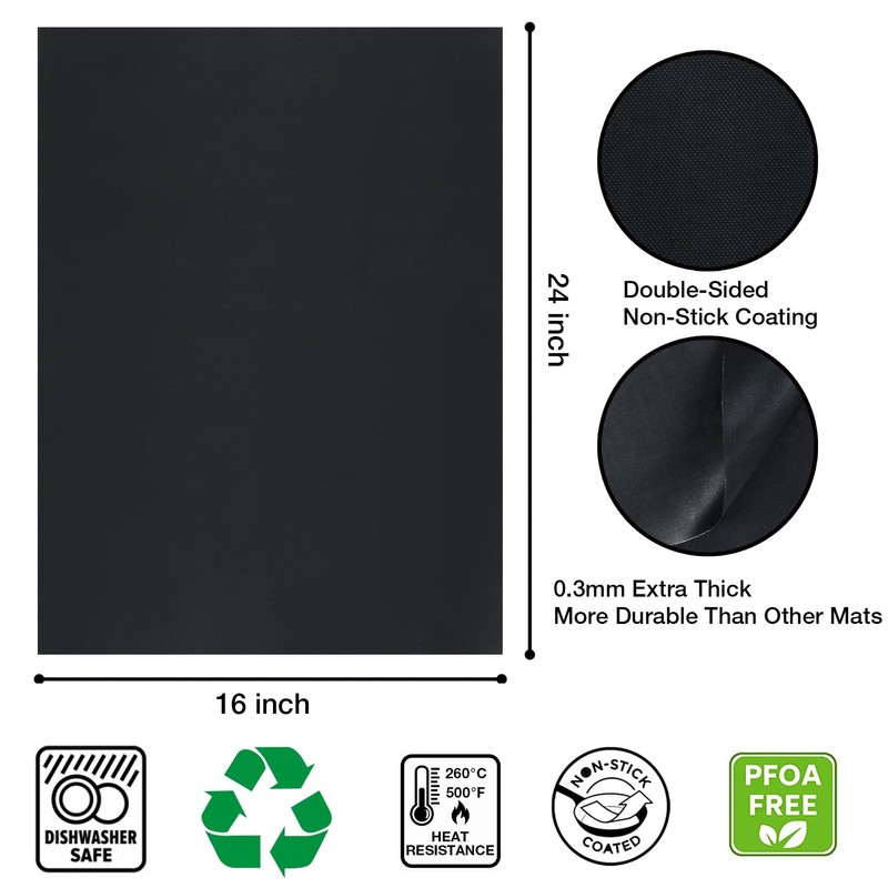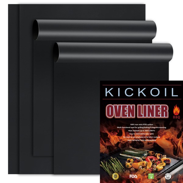 - PREMIUM MATERIALS -The KICKOIL 4 PCS 16"x 24" thick non-stick heavy duty oven liner mats are made from 100% PFOA-Free materials and premium PTFE-Fiberglass coating, durable, BPA free,health and safe. The oven mats heat up to 500°F/260°C without bad smell and don't produce harmful substances to the human body at high temperature,and will not melt,curl,or break.