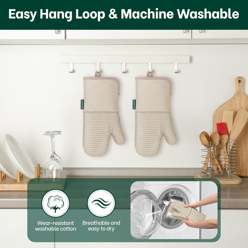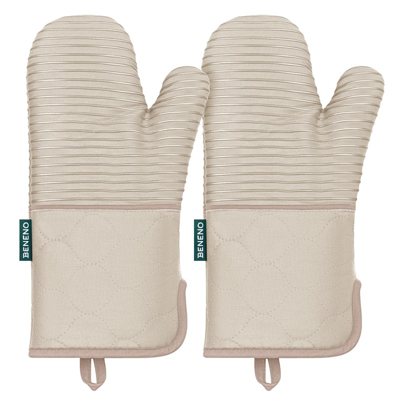 Oven Mitts, Beneno 2Pcs Non-Slip Silicone Textured Cotton Oven Mitts High Heat Resistant 500°F with Soft Terry Cloth Lining, 7"x14.3", Wide Opening Cuff Design, Comfortable & Flexible to Use, Beige
