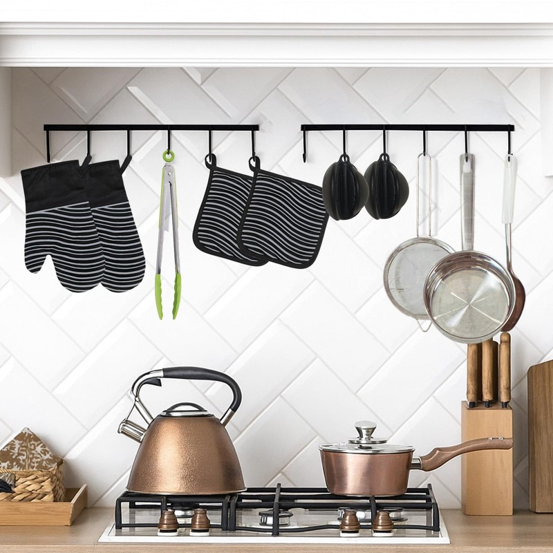 Reinforced hanging loops on every piece – oven mitt set, hot pads, and mini mitts – ensure clutter-free storage.