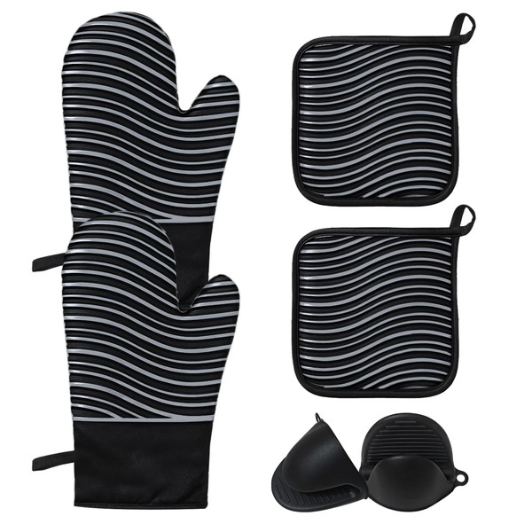 Oven Mitts & Pot Holders Set 6pcs - Premium Non-Slip Silicone Surface, 500°F Heat Resistant Kitchen Mitts for Cooking & Baking, Includes Extra Long Oven Mitts + Mini Pinch Mitts & Potholder (Black)
