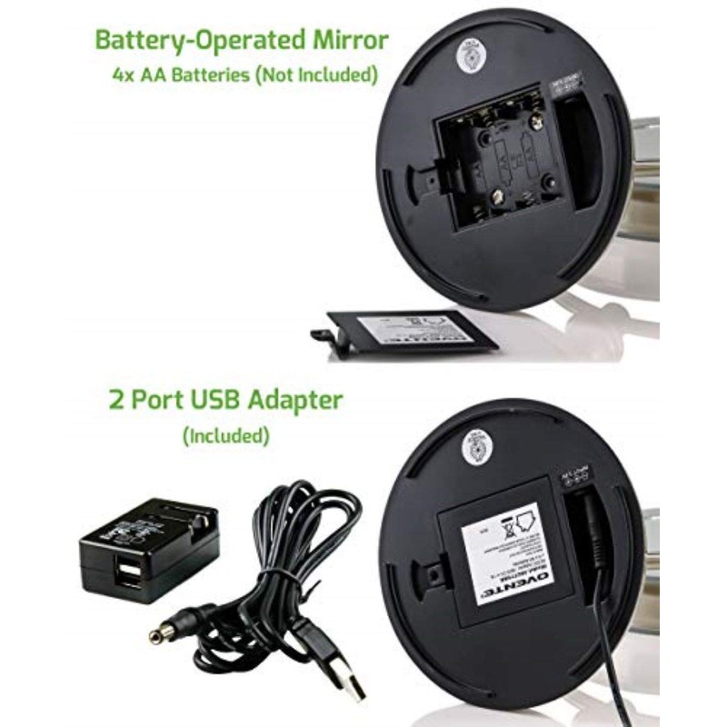 - 4 AA Battery & 2- PORT USB– Can be cordless, using only batteries (not included) or, operated by 2- PORT USB Adapter and cable (included) which allows you to charge a device while using the mirror.