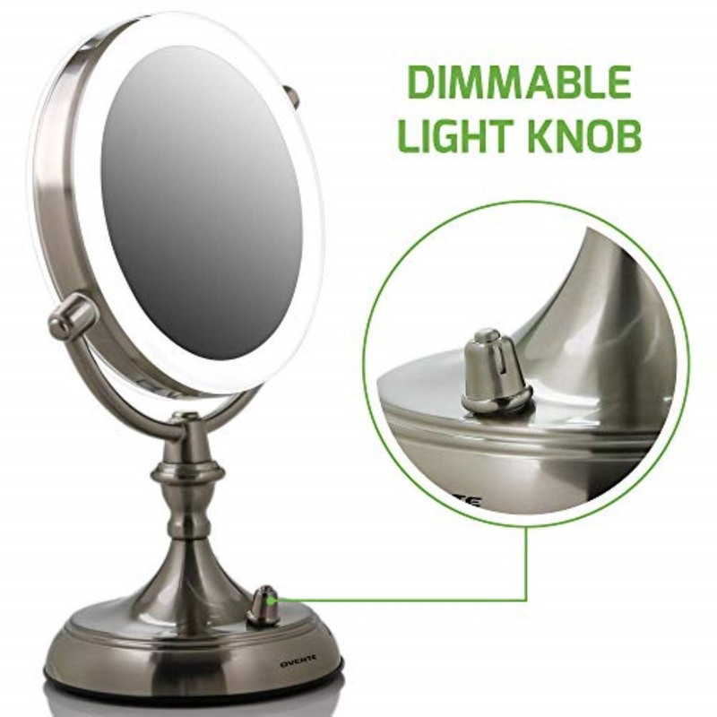 Ovente 9.5" Lighted Tabletop Makeup Mirror, 1X & 5X Magnifier, Adjustable Spinning Double Sided Round LED, Dimmer Switch, Battery USB Powered, Vanity & Skin Care, Nickel Brushed MGT95BR1X5X