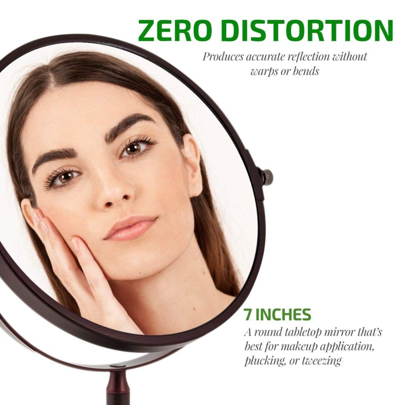 Ovente mirrors are built with a two - sided swivel magnified concave lens that is distortion-free, meaning it does not change the shape of the image. These features allow you to view yourself most accurately through its 7’’ spinning viewing space, precise 1x 5x magnification. Because of the magnifying lens, you must be about 4 inches away from the mirror to get the most accurate results and its unique internal wiring allows for a safe rotation at any angle. We strive to deliver a quality product to our customers. All of our tabletop mirrors have a wide and sturdy base that keeps the mirror stable and secure. This adjustable countertop mirror will take your décor to next level without the wobble. It’s perfect for bathroom, bedroom, grooming and vanity needs. This looking glass is perfect for people who love convenience and a clean space. Ovente tabletop mirrors have a classy, timeless design that flatters and enhances any room year after year. It can be used as a feature piece or also a convenient portable option to take with you from room to room. For all Feng Shui enthusiasts, Ovente mirrors are sure to bring an influx of positive energy to the area it’s in accrediting this to its sleek, luxurious look and easy to use features. Ovente’s MNLDT Series Table Top Cosmetic Mirror is available in: 1 Deluxe Finishes: Antique Bronze 1 Size Offer: 7 inch 1 Magnification Offers: 1x5x