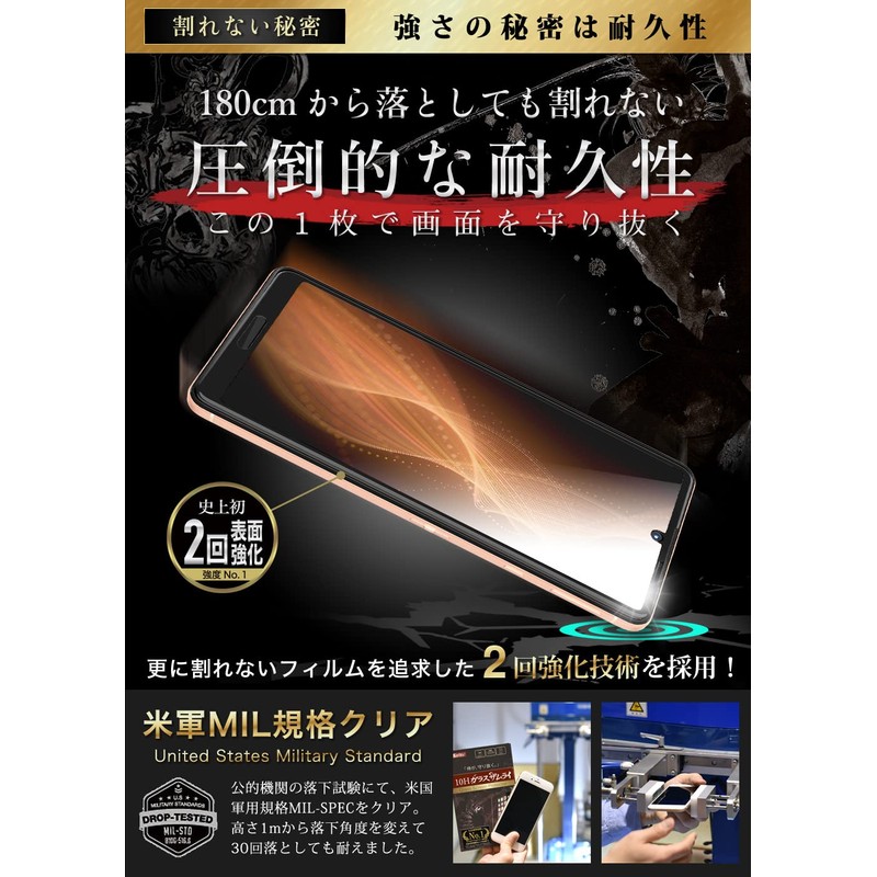 • 【ナイフでも傷つかない】現在市場では最も硬い10Hの表面硬度。画面割れ”ゼロ”を目指し、カッターでも傷つかず、180cmから落としても割れない耐久性を実現