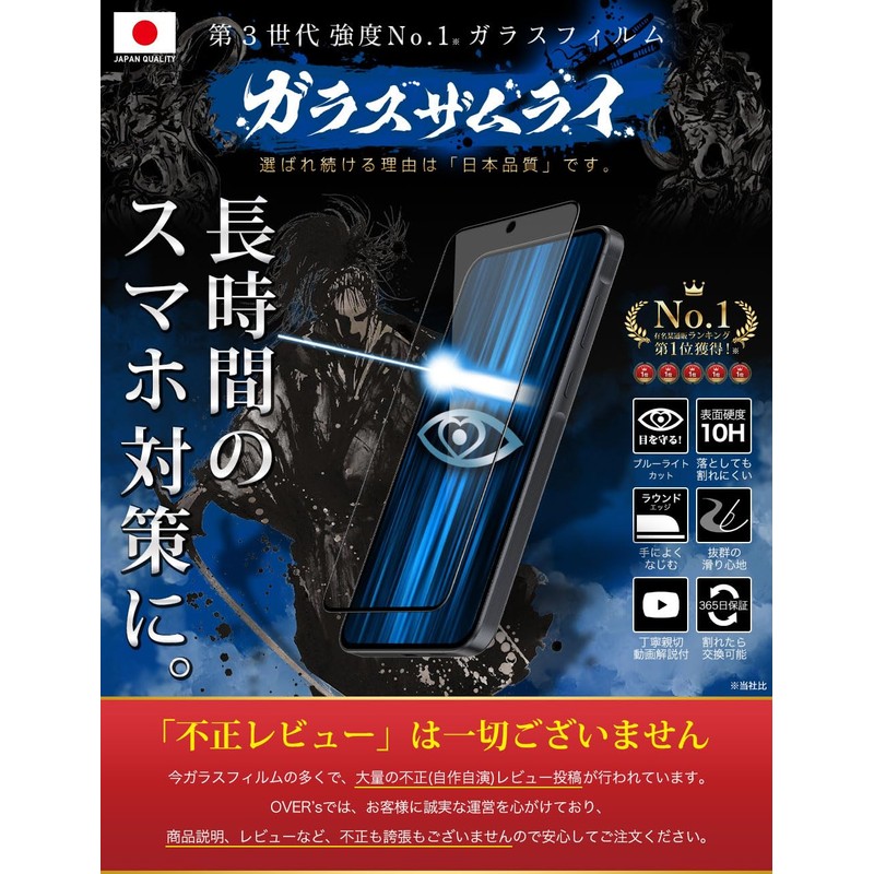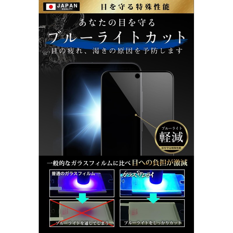 - 当社のブルーライトカットフィルムは完全透明ではなく黄色みがかっております。全面保護は、スマホ前面の情報表示部分およびその周囲の一部を表すもので、前面全てを指すものではありません。【 こ の 1 枚 で 守 り 抜 く ~ 第 3 世 代 ガ ラ ス フ ィ ル ム 】 ジャパンクオリティ ~ ガラスザムライが選ばれ続ける理由は「日本品質」です。 柔軟性と強度を兼ね揃えた新世代の高品質ガラスフィルム「より割れない」「より浮かない」「角割れしない」 “ 第3世代 ガラスフィルム “ 登場。【 ガ ラ ス ザ ム ラ イ 】サムライには武士道の「義と勇」が込められています。 .