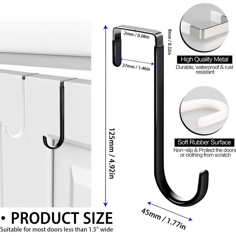 - High-Quality Material: Made from premium metal with a soft rubber coating, these over the door hooks protect both your doors and garments from damage, allowing quiet and smooth door closure.