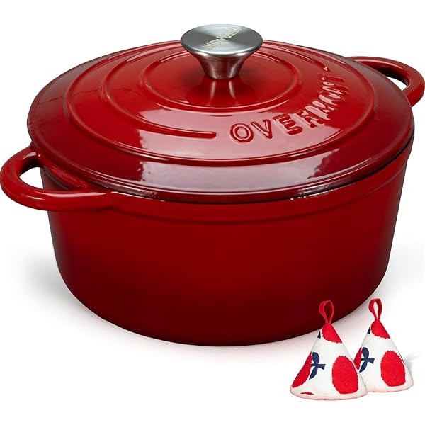 Overmont Enameled Cast Iron Dutch Oven - 5.5QT Pot with Lid Cookbook & Cotton Potholders - Heavy-Duty Cookware for Braising, Stews, Roasting, Bread Baking red