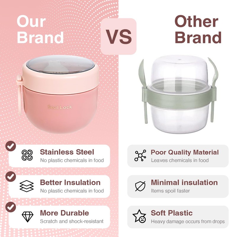 Introducing our versatile 20oz Seal Lock insulated food jar – the ultimate solution for all your meal prep needs! This multifunctional marvel is designed to elevate your eating experience across various uses, from indulging in creamy overnight oats to savoring a delectable yogurt parfait on the go. Need a reliable companion for your lunchtime cravings? Look no further – our food jar doubles as a spacious lunch box snack container, ensuring your treats stay fresh and enticing until that midday break. Crafted with top-tier insulation technology, this food jar boasts the exceptional ability to maintain the optimal temperature of your culinary creations, keeping them delightfully warm in the chilly months and refreshingly cool during scorching days. Say goodbye to mediocre meal moments and embrace the convenience of our 20oz insulated food jar. Elevate your meal prep game and enjoy every bite at the perfect temperature, wherever and whenever. Choose innovation, choose freshness – choose our insulated food jar.