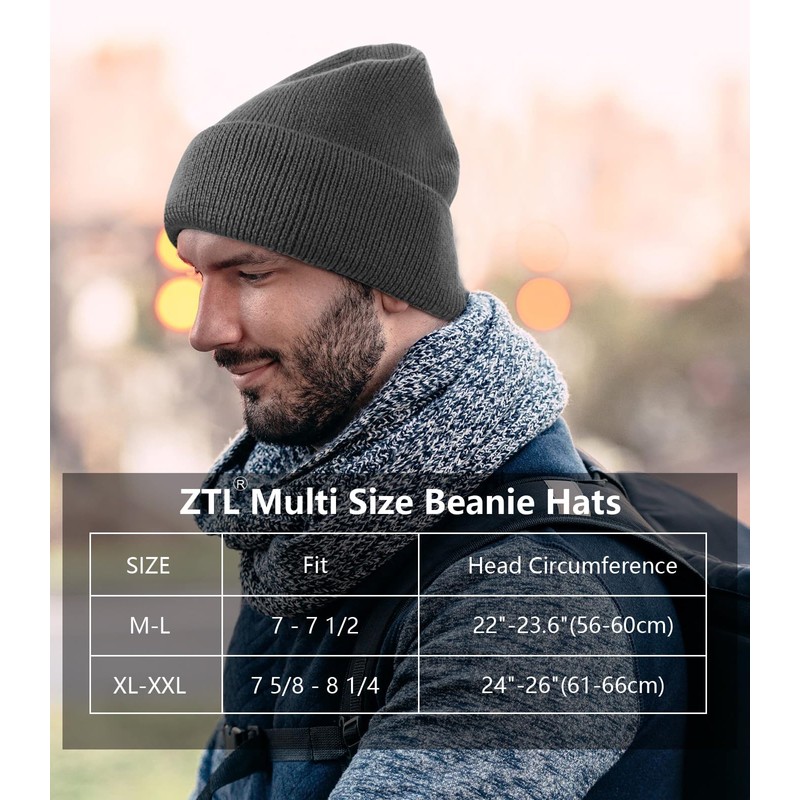 - Multi Size Beanie Hat: M-L Size fits normal heads 22"-23.6"(7 - 7 1/2), XL-XXL Size fits big heads 24"-26"(7 5/8 - 8 1/4). ZTL Multi Size Beanie Cap is specially designed to fit all head sizes for both men and women, providing excellent temperature control and comfort. Highly practical elastic knit hat, trendy and versatile. It pairs well with almost any winter outfit.