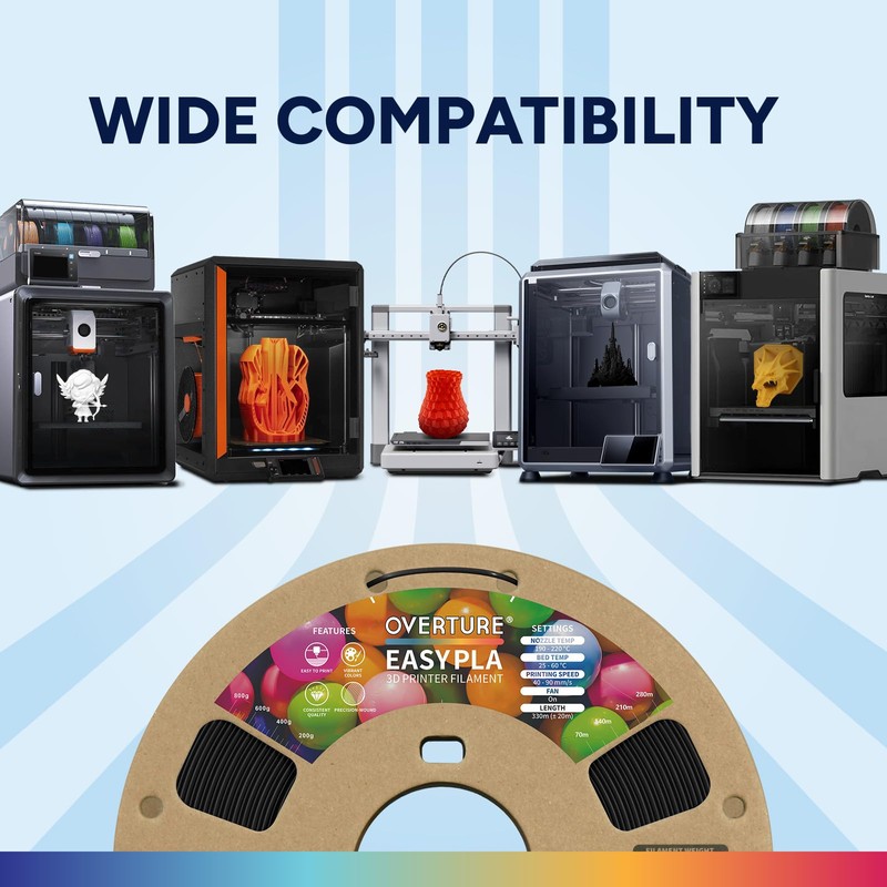 - Wide Compatibility and Color Selection Overture filaments seamlessly integrates with most consumer and industrial 3D printers. Explore your creative side with our extensive selection of vibrant colors, ensuring a spectrum of possibilities for your unique creations