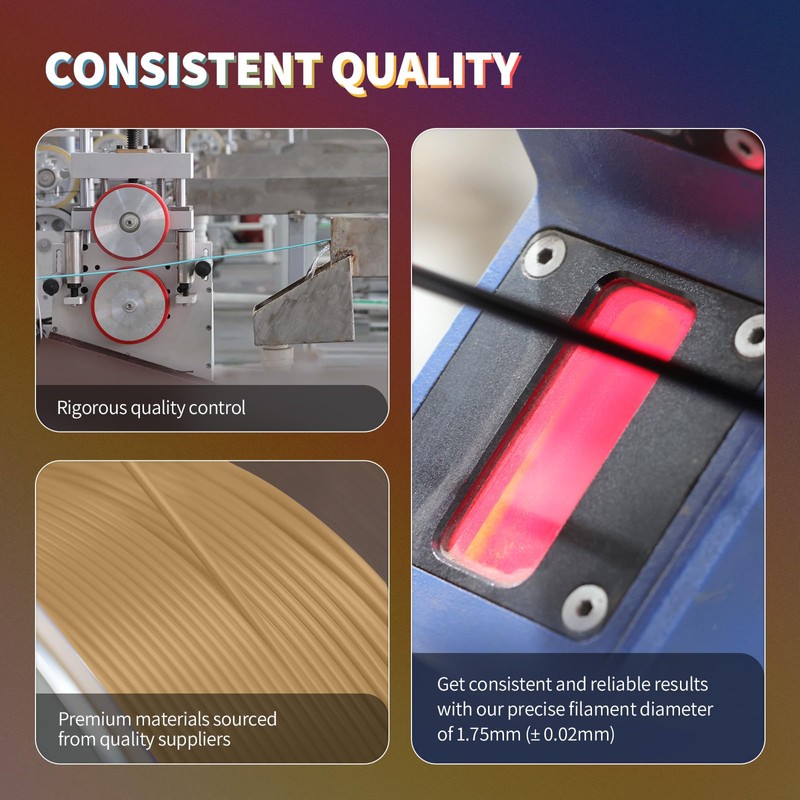 - 【Dimensional Accuracy & Consistency】 Utilizing CCD cameras and closed-loopcontrols, we continuously monitor and adjust the extrusion process in rea-time.Our advanced technology and meticulous control measures guarantee a filamentdiameter of 1.75mm with a tolerance of +/- 0.02mm
