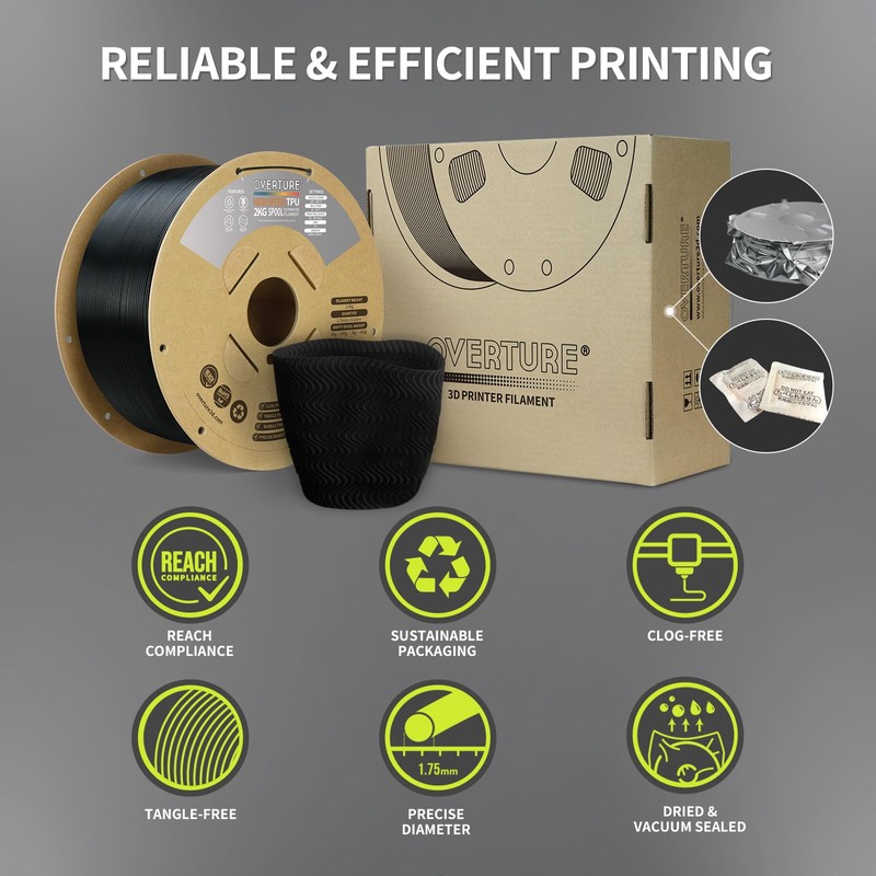- 【Excellent Layer Adhesion】 Setting the standard for impeccable layer adhesion and delivering impressive results. Overture TPU features optimal layer bonding and a flawlessly smooth finish, make these soft filaments of of high Elasticity easy to print
