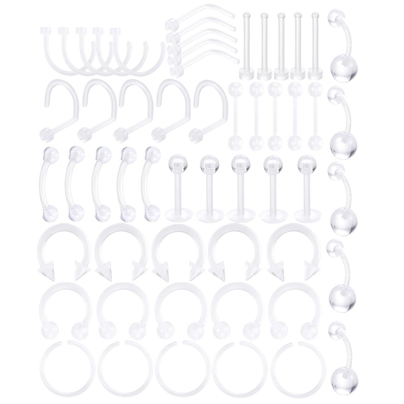 Oveta 55pcs Clear Piercing Retainers Flexible Bioflex 14G 16G 20G Navel Belly Button Ring Lip Labret Eyebrow Tongue Barbells Cartilage Tragus Earrings Retainer