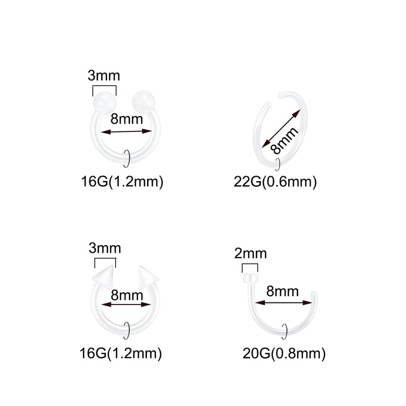 - ❃ 【Gauges】- CLear Nose Studs-20G, CLear Eyebrow Barbells-16G, Clear Lip studs-16G, Clear Horseshoe Rings-16G, Clear Tongue Bars-14G, Clear Belly Bars-14G, Clear Seamless Rings-22G.