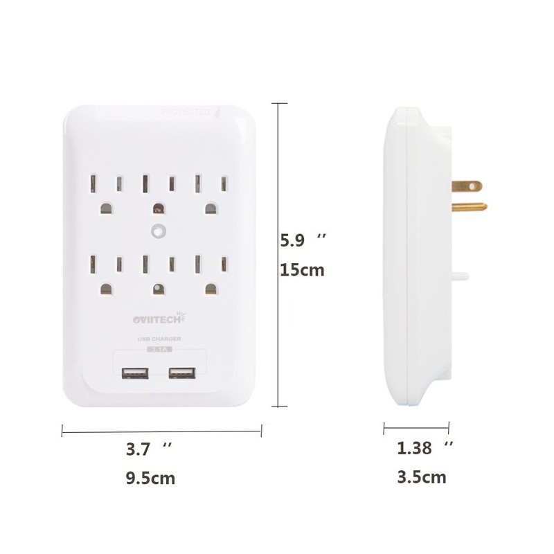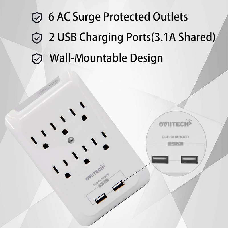 OviiTech Multi-function Wall Mount Adapter, Surge Protector Charging Station Offer Two 3.1AMP Shared USB Charging Ports and 6 AC outlets