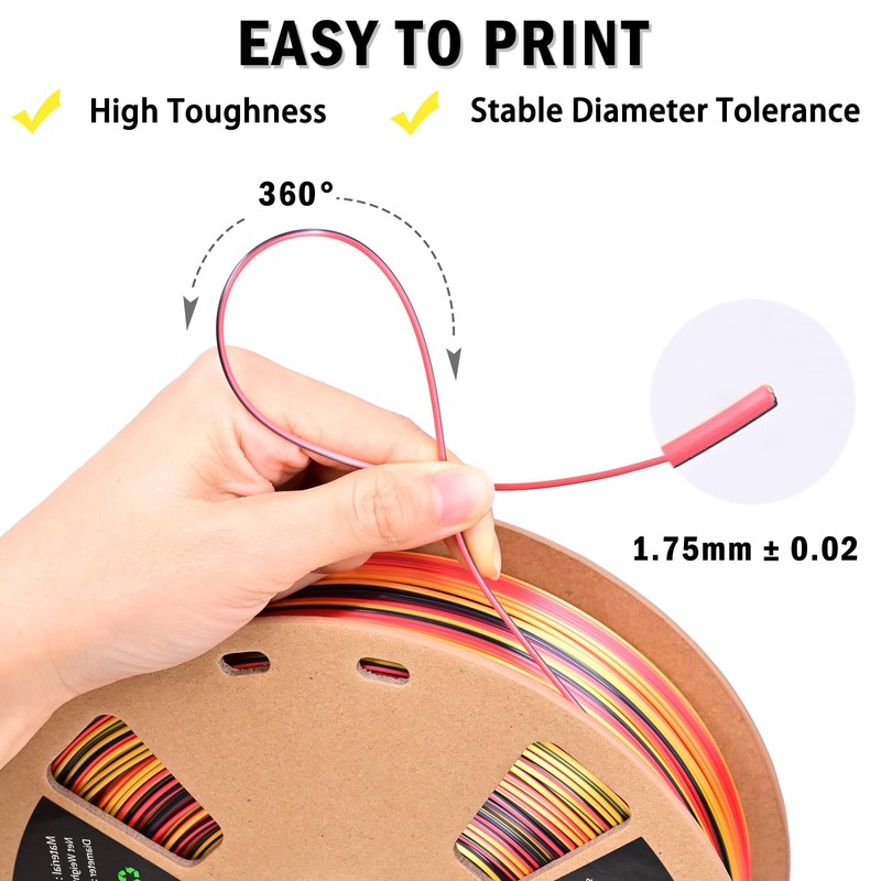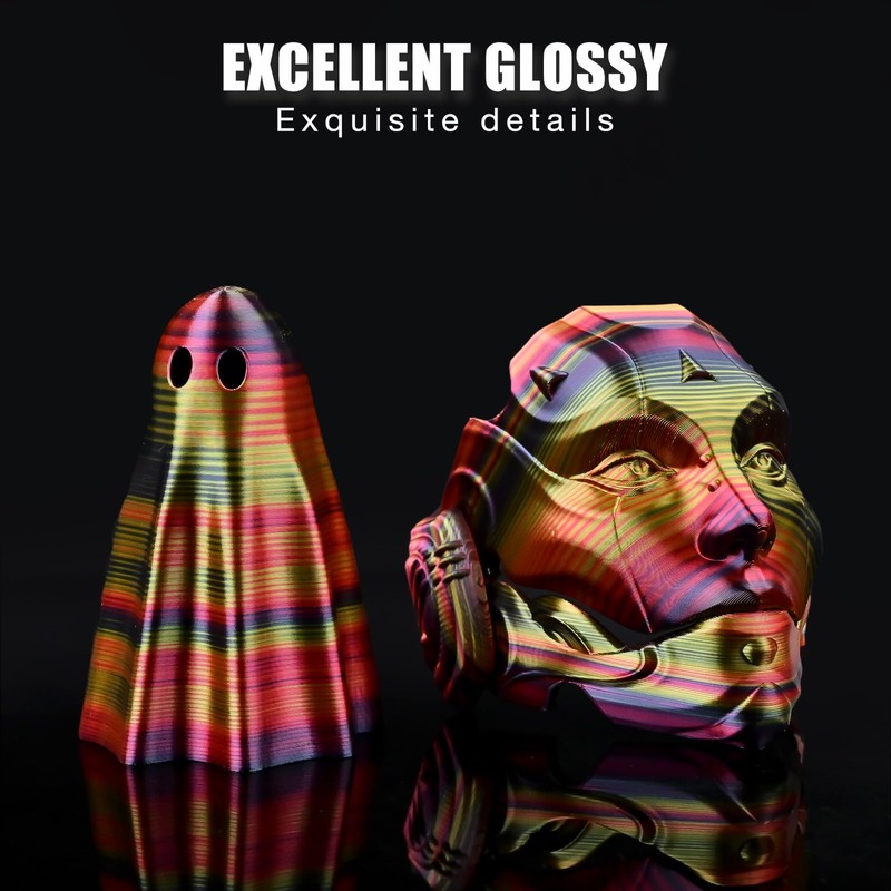 - Upgrade PLA Raw MaterialThe raw material comes from Europe, and it has been developed and modulated to show a charming gloss on the PLA. No jamming, no bubble, no tangle, and no layer line, just silk color changing PLA filament.