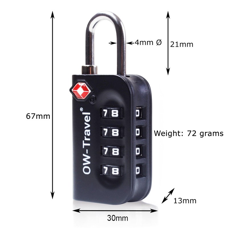 - 【Durable & Robust】 TSA luggage lock. The OW-Travel suitcase lock is crafted from Robust Zinc Alloy making it near impossible to cut through or crack using regular tools. 4 dial numerical TSA approved luggage locks allows you to create over 10,000 combinations, so guessing your combo is almost impossible. A Padlock designed for a suitcase. Double your security with this combination lock for suitcase: Unlike ‘copycat’ Combination Padlocks that leave you with a false sense of security.