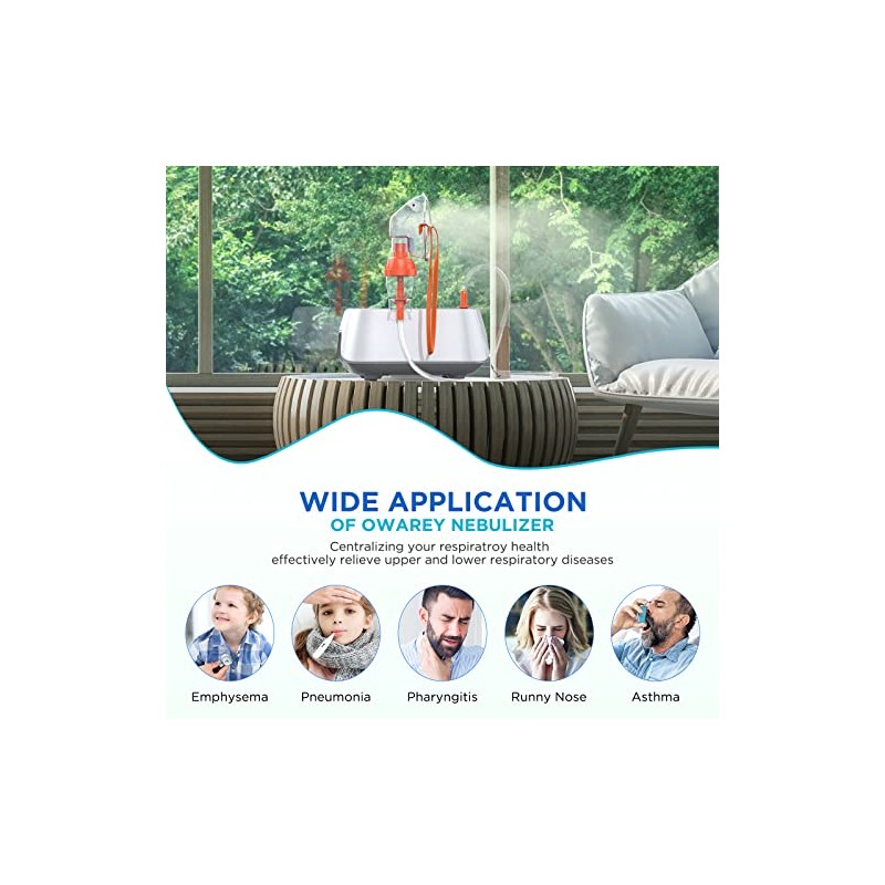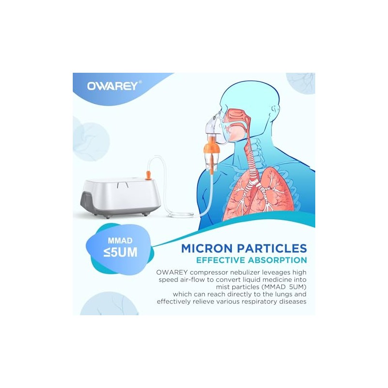 - [Rapid Relief In Minutes] OWAREY compressor nebulizer machine produce more stable, finer mist in a continuous manner (MMAD<5m). 85% of particle diameter is measured below 5m that can penetrate directly to the affected tissues, enabling better absorption and effectively treating various respiratory diseases.
