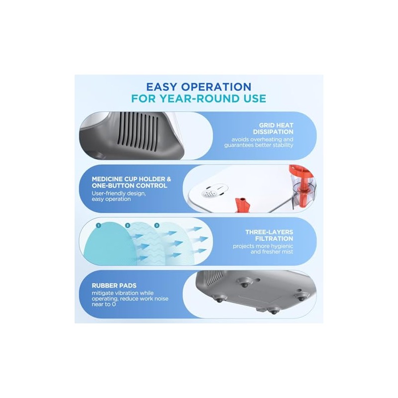 - [Exclusive Home Nebulization Design] Our jet nebulizer equips anti-slip pads at the device's bottom to enable shock absorption and noise reduction, lowering operational volume down to 50dB. Compact & portable design with a medicine cup holder to liberate hassled nebulization routine and provide seamless care for your respiratory health.