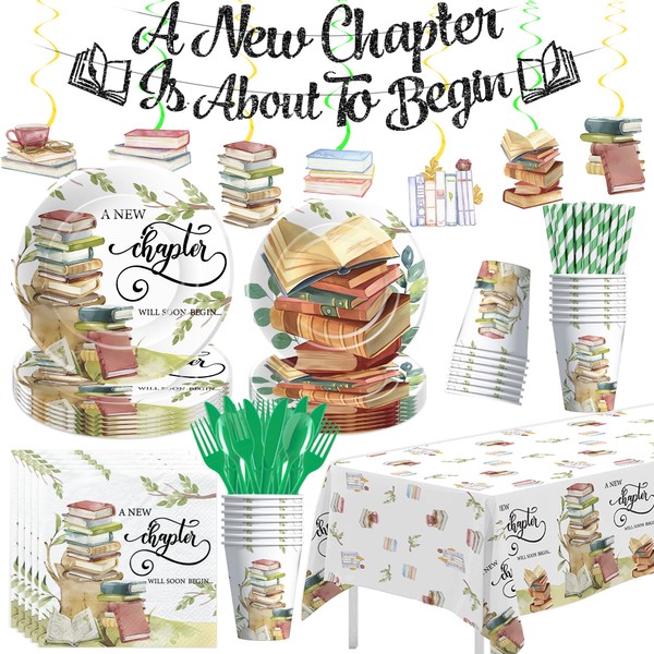 - 【Package Included】Story book baby shower decorations tableware included 24pcs 9'' storybook dinner plates, 24pcs 7'' book club party plates, 24pcs paper napkins, 24pcs paper cups, 24 sets of disposable cutlery, 1 set a new chapter is about to begin banner, 24pcs paper straws, 1pcs book party tablecloth, 7pcs/set book club party swirls. for book theme farewell party decorations
