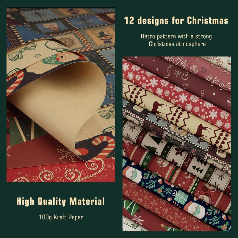 • 12 Vintage Designs:including cute colourful Santa Clause, Christmas moose, Christmas snowman, Christmas tree and other special wrapping paper designs, many styles can bring you a strong Christmas feeling and can give your loved ones a Christmas surprise
