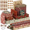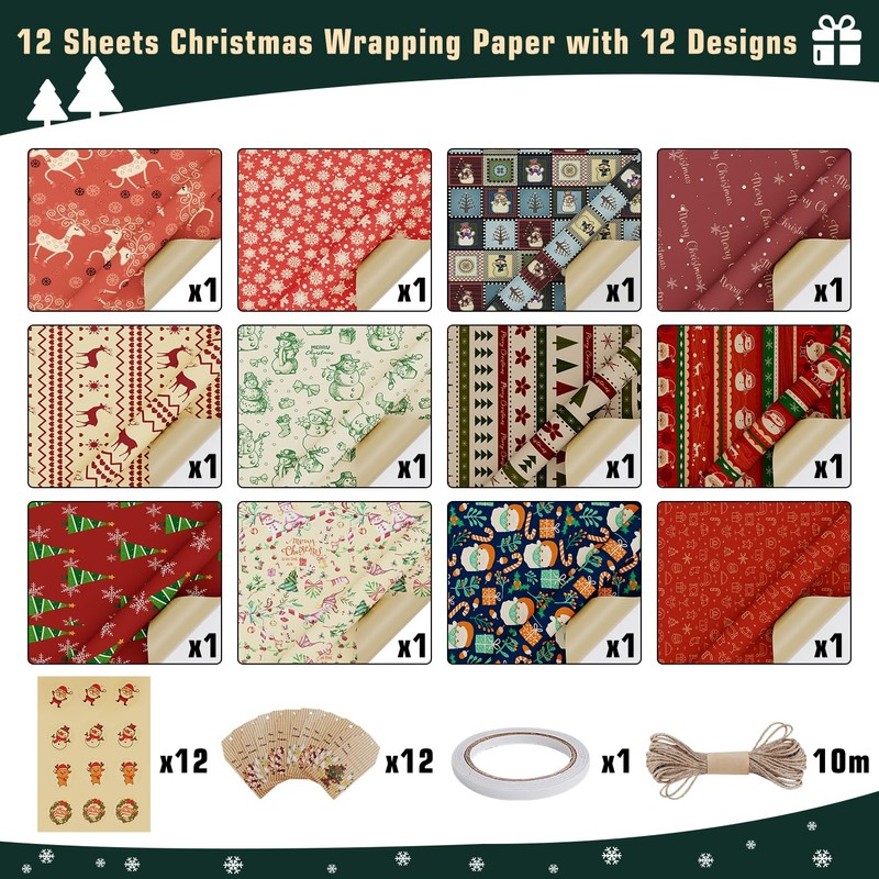 OWill Christmas Wrapping Paper,12 Sheets 50x70cm Recycle Xmas Kraft Paper 12 Christmas Wrapping Paper Designs with 10m Jute String 12 Labels 12 Stickers and a Roll of Tape