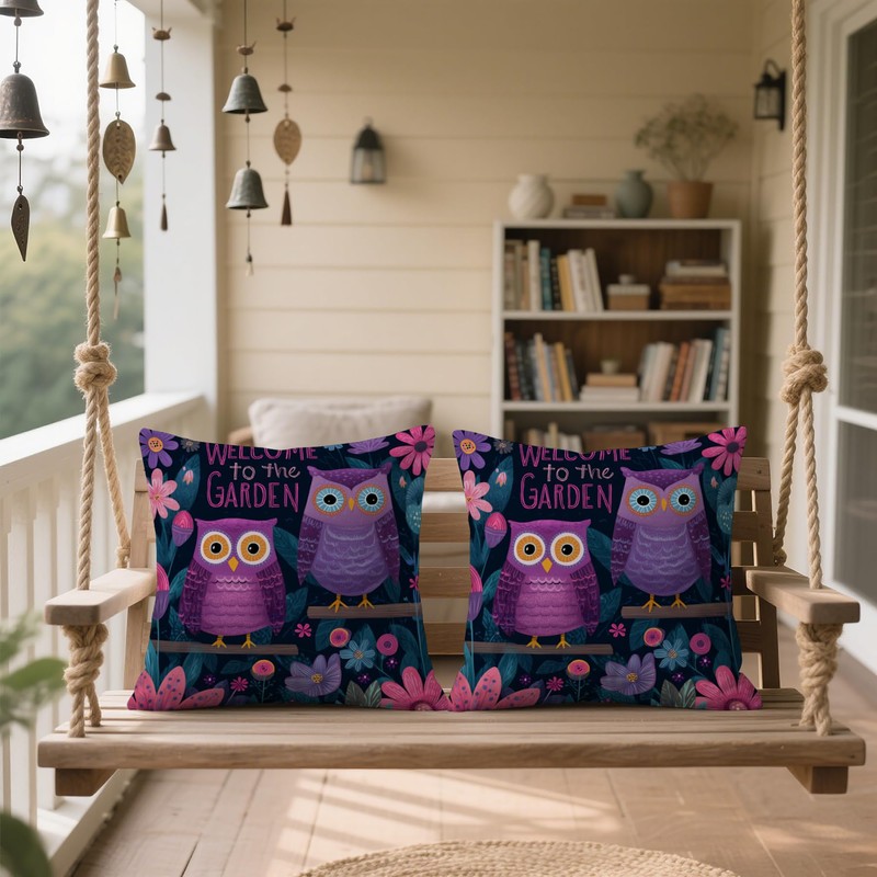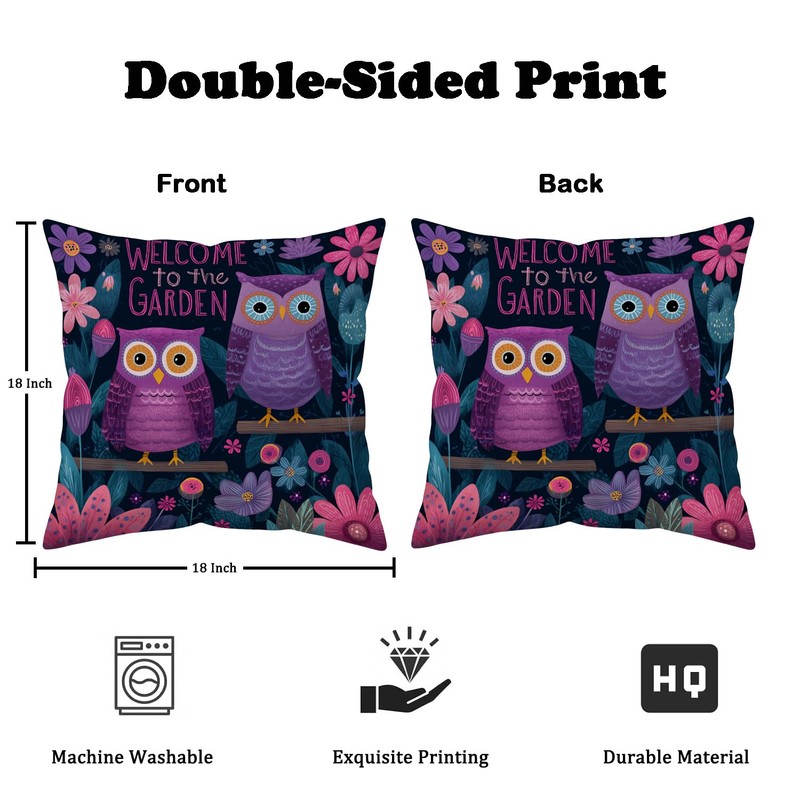 - Charming Owl Design: Featuring two adorable purple owls surrounded by blooming flowers with the words “Welcome to the Garden”, these pillow covers bring a warm, inviting vibe to any space