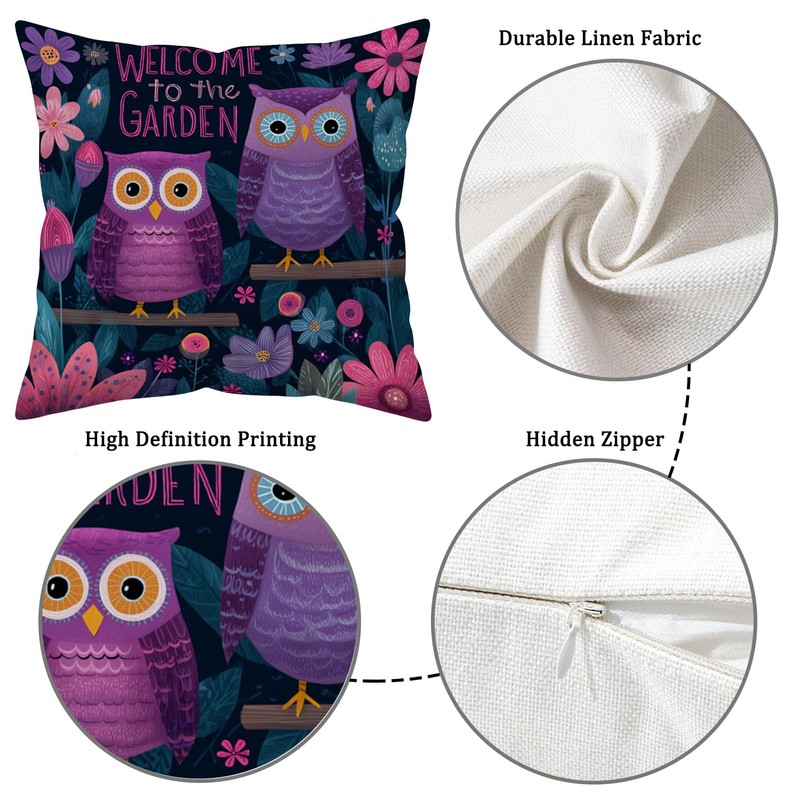 Each pillow cover features double-sided printing, ensuring the detailed owl and floral pattern looks stunning from every angle. The colors remain vivid and eye-catching, adding elegance to your sofa, couch, bed, patio chair, or garden bench. The hidden zipper closure is smoothly sewn, allowing easy removal and insertion of pillow inserts while keeping a sleek and polished look.