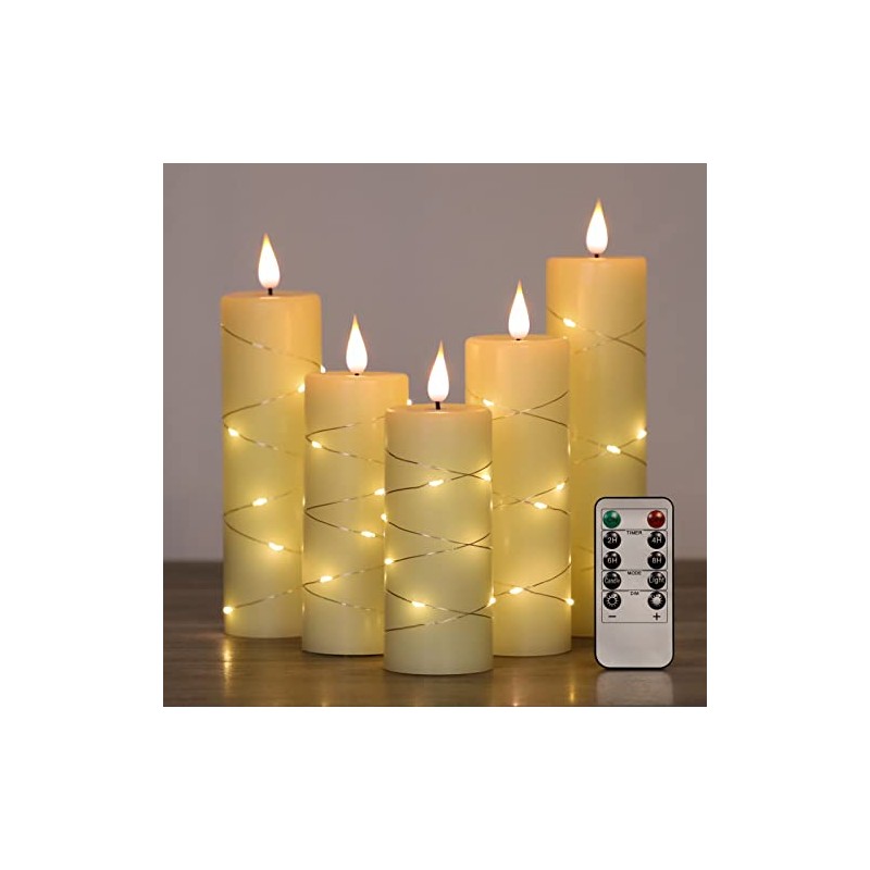 OWLBAY Set of 5 Flickering Flameless Candles with Embedded String Light, Real Wax Battery Operated LED Pillar Candles with Realistic 3D Flame, Remote Control and Timer, Idael for Daily/Holiday Decor