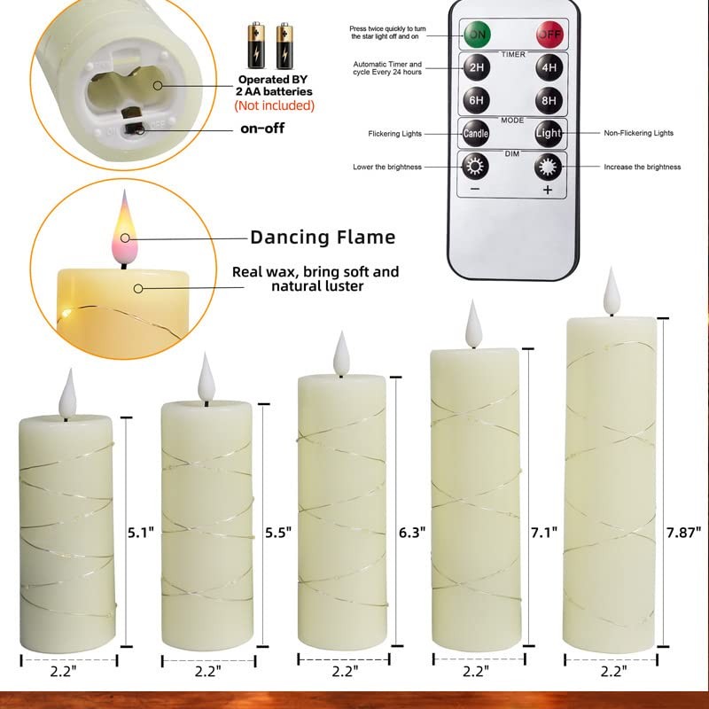 Candle Size: 2.2"Diameter x 5"/5.5"/6"/7"/8"HeightMaterial: Wax + ABS Plastic + LED