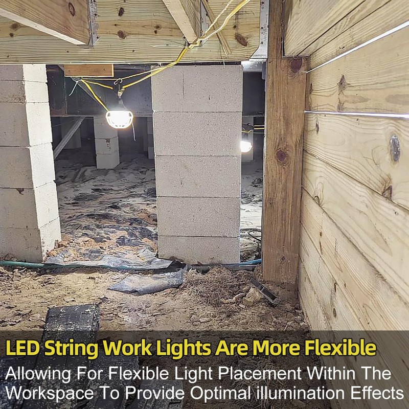- [Wide Applicability]: The LED string work light is good for outdoor or indoor application, such as construction site, workshop, storage shed, warehouse, shipping container, crawl space, garage, attic, basement, backyard, campsite or anywhere need extra light.