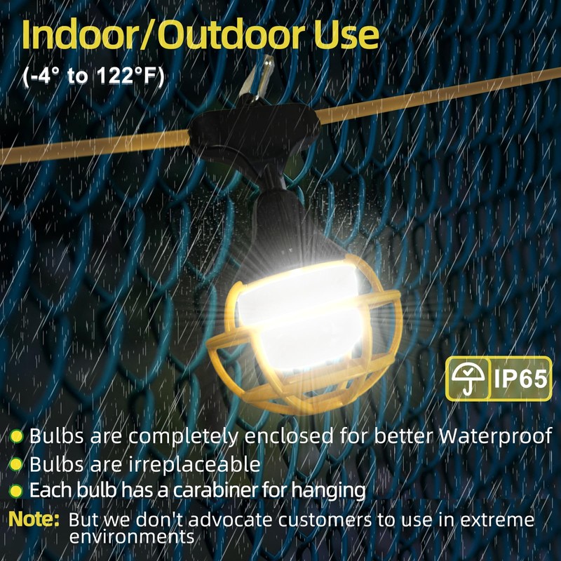 - [Heavy-duty & Daisy-chained Design]: The construction string lights with cages are built to withstand the rigor conditions on construction sites. This construction rope lights is IP65 waterproof, making them suitable for outdoor use. You can connect up to 3 sets of 50ft construction string lights, producing an impressive total of 24,000 Lumens through end-to-end connections, which can be extended to cover larger areas.