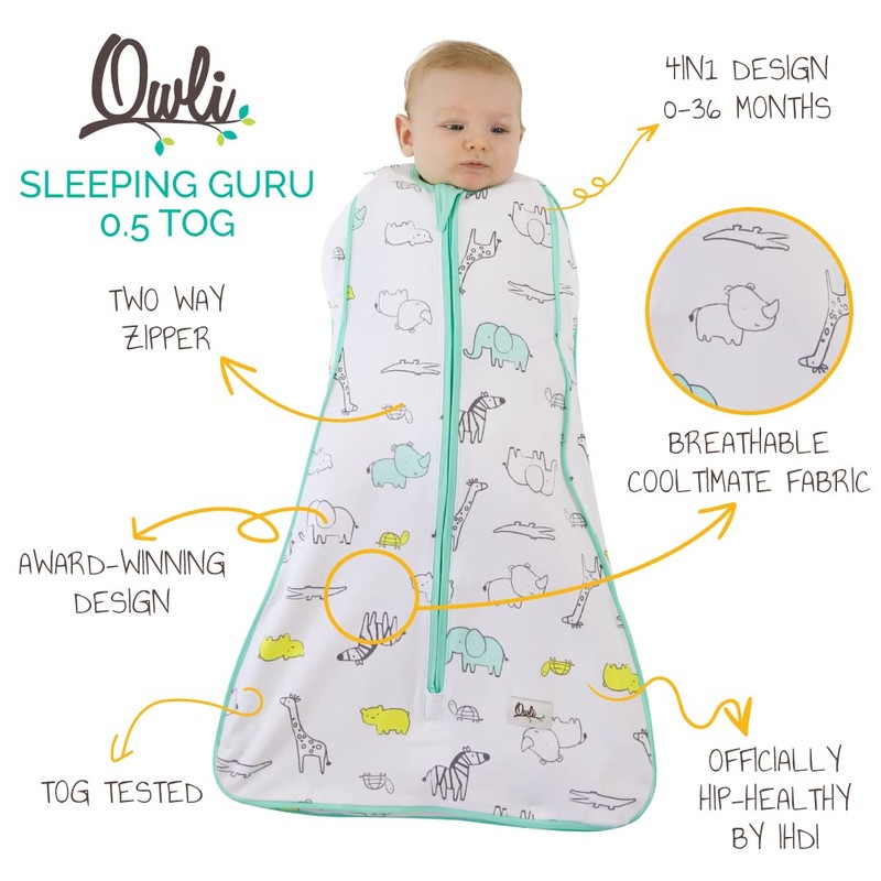 Owli Sleeping Guru Swaddle & Sleeping Bag, Zoo Zoo, 0-36 Months, 4-In-1 Swaddle, Award-Winning Design, Officially Hip-Healthy, 0.5 TOG, OEKO-TEX Certified Cotton-rich Fabric