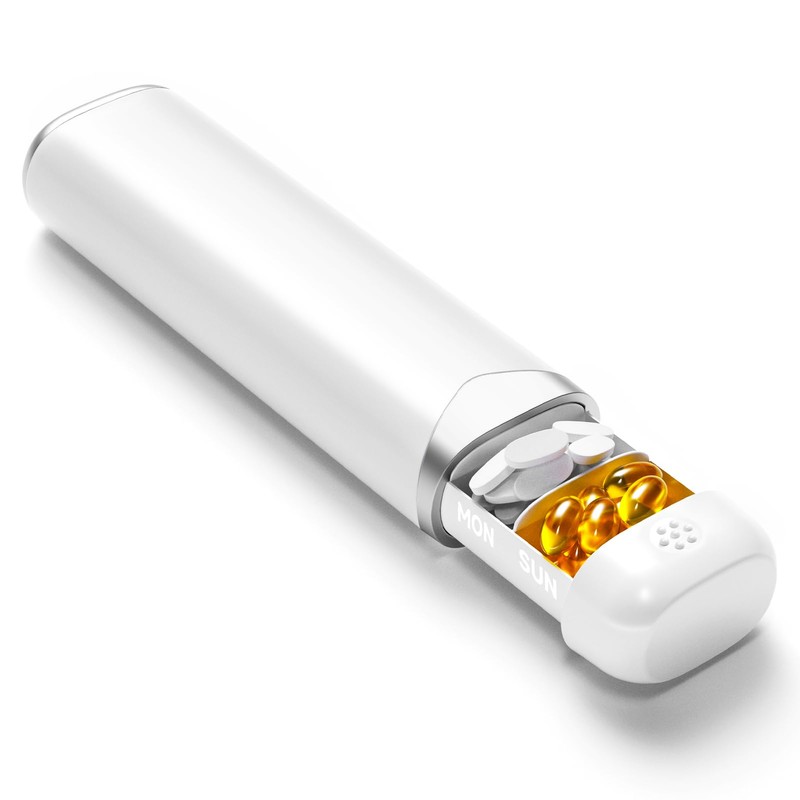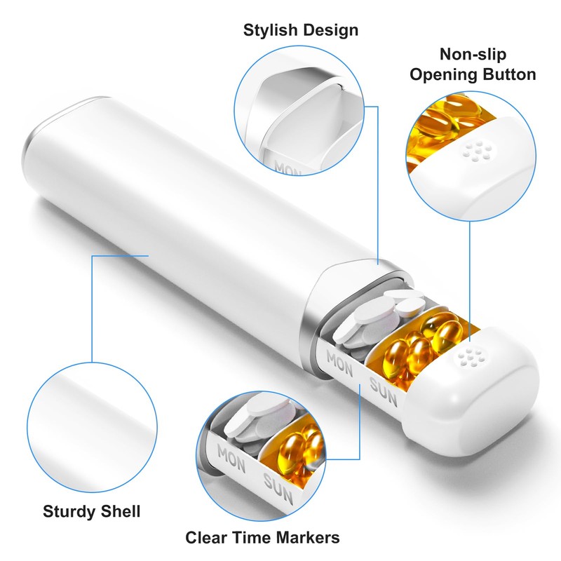 OWLMATE Pill Box 7 Days, Supplement Box, Pill Box, Dietary Supplement, Medication, Pills, Tablet Organiser for On the Go (White + Silver)