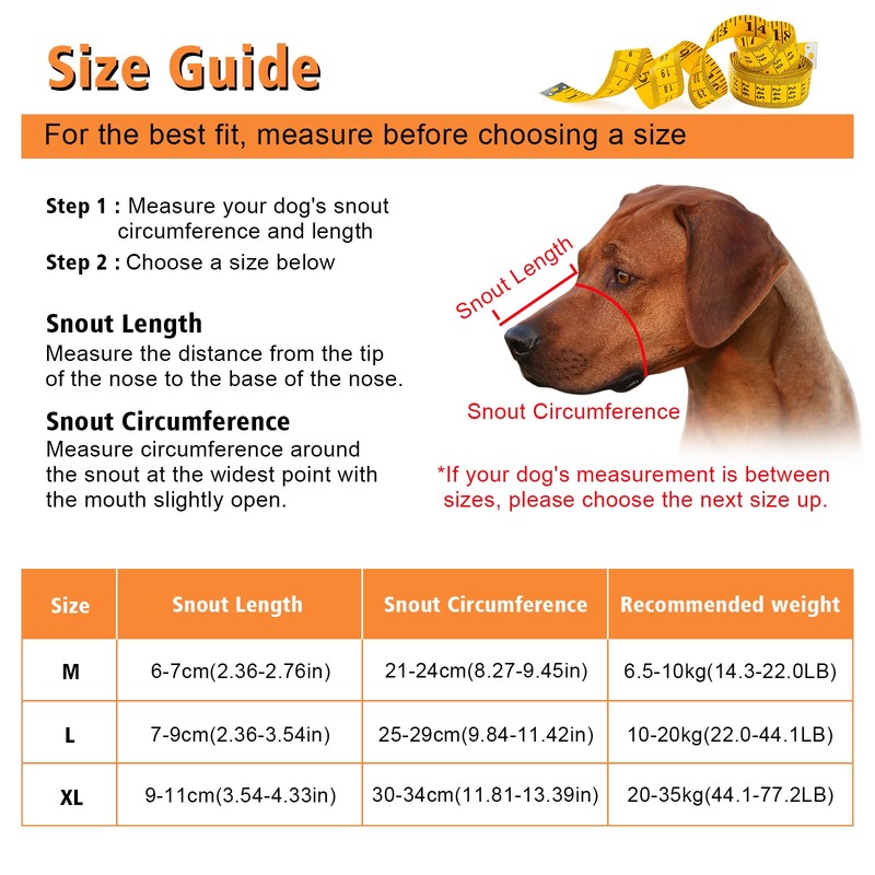 - Easy to Use: Open the buckle and put it on your dog’s mouth, adjust the webbing to the right fit to finish the wearing. Please measure your dog’s mouth before purchase. It’s important to choose the right size for your dog. (The size chart is for reference only.)