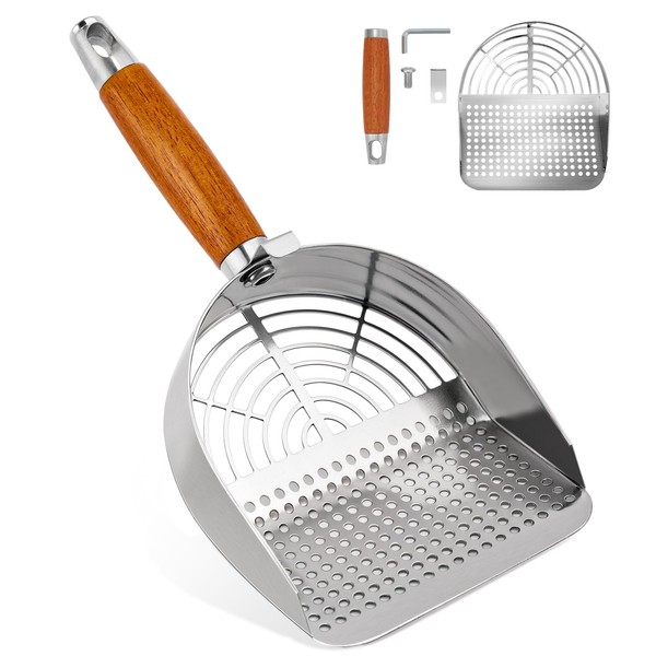 - Comfortable Wood Handle: The stainless steel litter scoop features a comfortable wood handle that provides a good grip, making it easy to use even when wet. Its ergonomic design fits well in your hand, reducing strain and making cleaning effortless