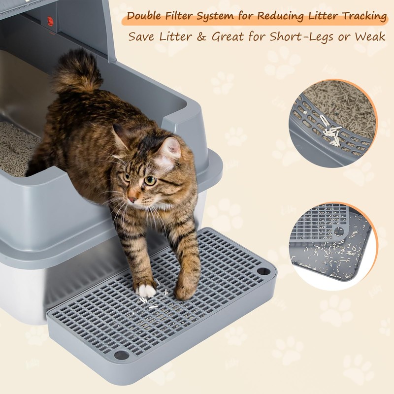 - Cat Litter Scoop & Filtered Footstool: Our efficient litter scoop makes cleaning up your cat's waste a breeze, while the innovative filtered footstool not only allows your kitten to effortlessly access the stainless litter box but also effectively traps stray litter from their paws, ensuring a clean and comfortable home environment